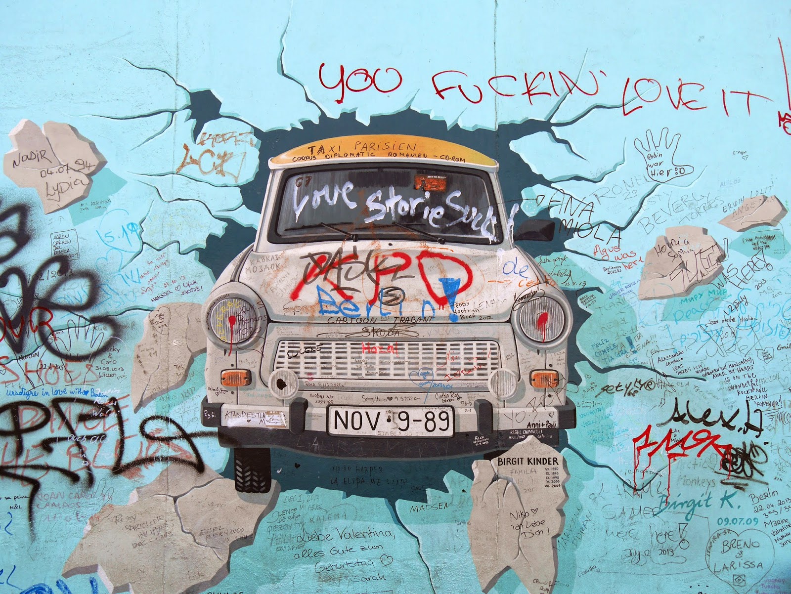 Berliner mauer graffiti trabi. Mein trabant in berlin an der east side gallery in der nachfolgenden bildergalerie sehen sie den jeweiligen zustand meines bildes in der zeit vom test the best ab 1990 zum test the rest ab 2009. Reichstag oder checkpoint charlie sind ebenso auf der route wie die ehemalige stalin allee oder der längste teil der berliner mauer der noch steht. Werden dagegen von graffiti und mauerkunst freigehalten und frisch entstandene kunstversuche werden schnellsten entfernt. Auch david hasselhoff ist dabei und erinnert sich an seinen legendären auftritt kurz nach dem mauerfall zurück. Honecker und breschnew beim sozialistenbussi das berühmteste gemälde an der berliner mauer wurde jetzt entfernt. Die reste der berliner mauer in der bernauer str. Im frühjahr 1990 nach der öffnung der berliner mauer wurde dieses teilstück von 118 künstlern aus 21 ländern auf einer länge von 1316.
