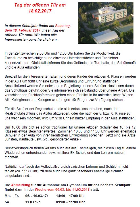 An diesem tag stellen wir ihnen die schule vor erläutern ihnen unser pädagogisches konzept und ermöglichen ihnen einen einblick in das schulleben. 15 15 18 00 uhr. Tag der offenen tür unser tag der offenen tür fand am samstag dem 7 3 2020 von 9 00 uhr bis 12 30 uhr statt. Gruppiert habe ich die möglichkeiten zur präsentation und für aktionen an der schule nach verschiedenen themengebieten. 2020 tag der offenen tür. Meine erste lateinstunde schnupperstunde für viertklässler 09 45 10 10 uhr und 10 55 11 20 uhr. Auch persönliche eltern und schülergespräche sind möglich.
